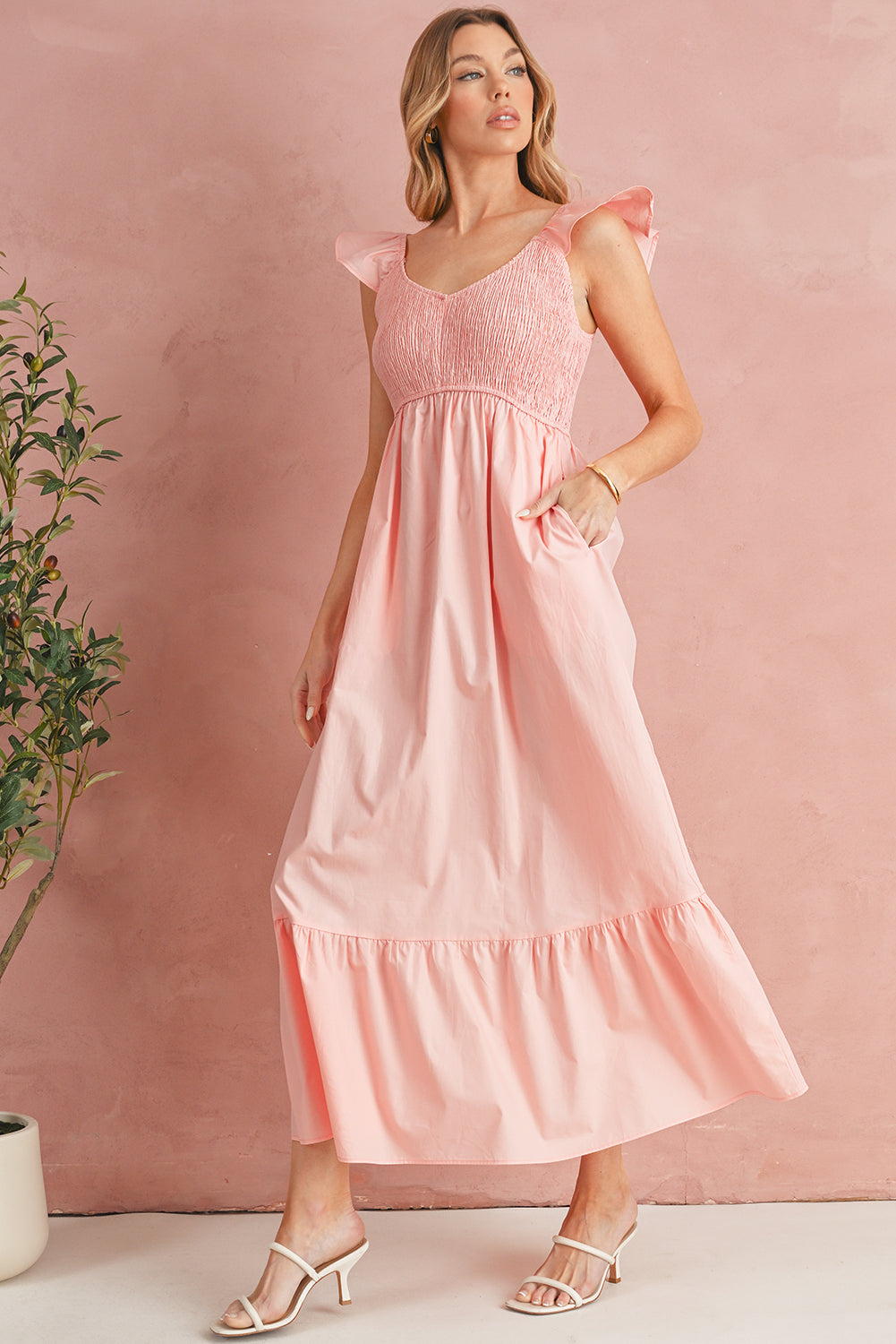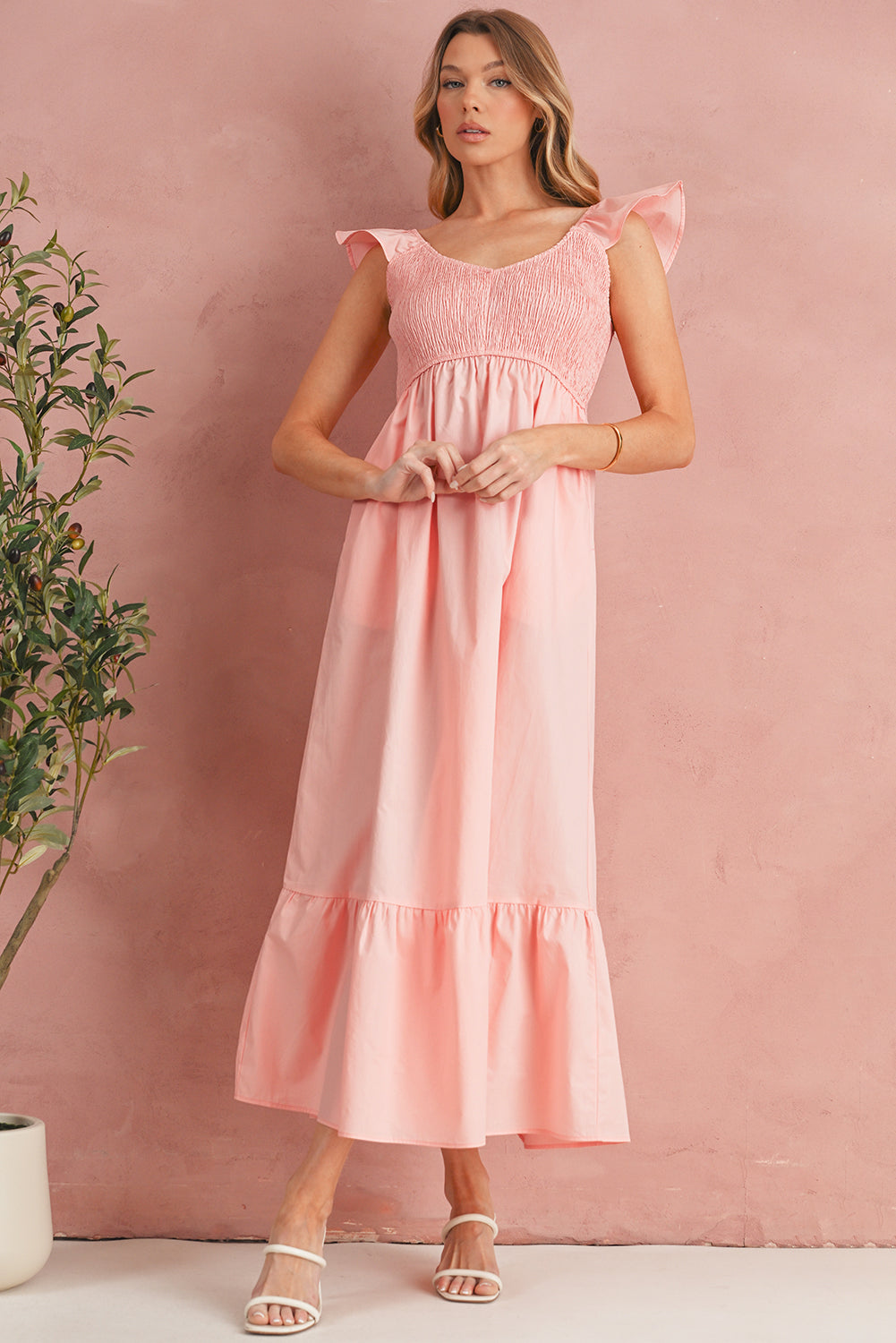 Apricot Pink V Neck Flutter Sleeve Smocked Bodice High Waist Ruffle Maxi Dress