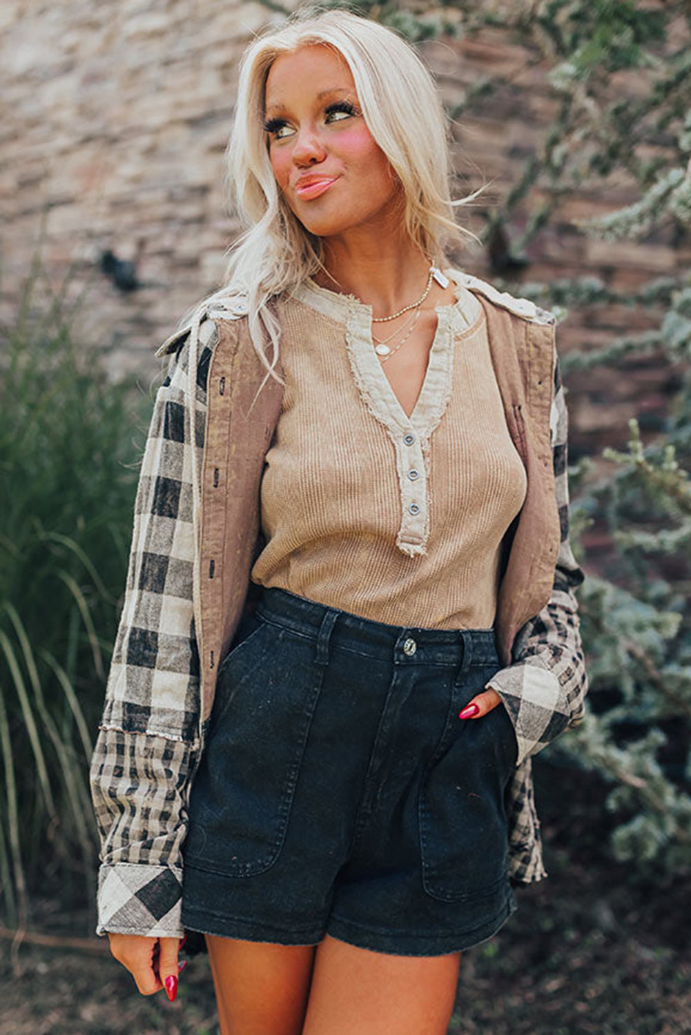 - Crafted with a blend of plaid and patchwork patterns, this shacket exudes a trendy and versatile style suitable for various occasions.
