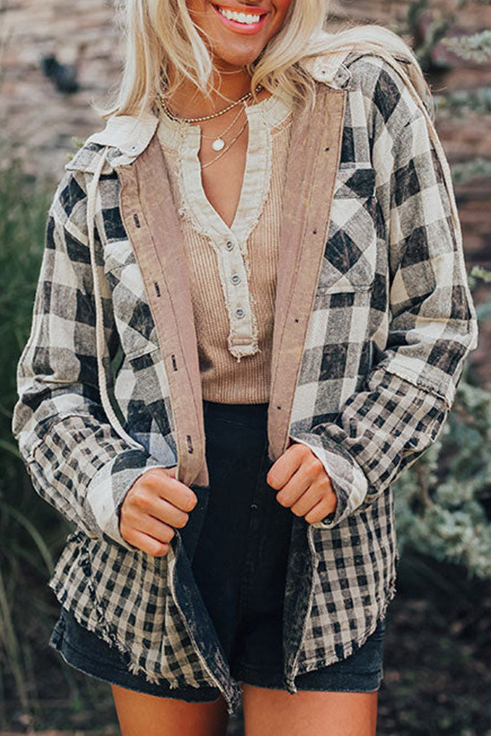Black Plaid Patchwork Drawstring Hooded Raw Hem Shacket
