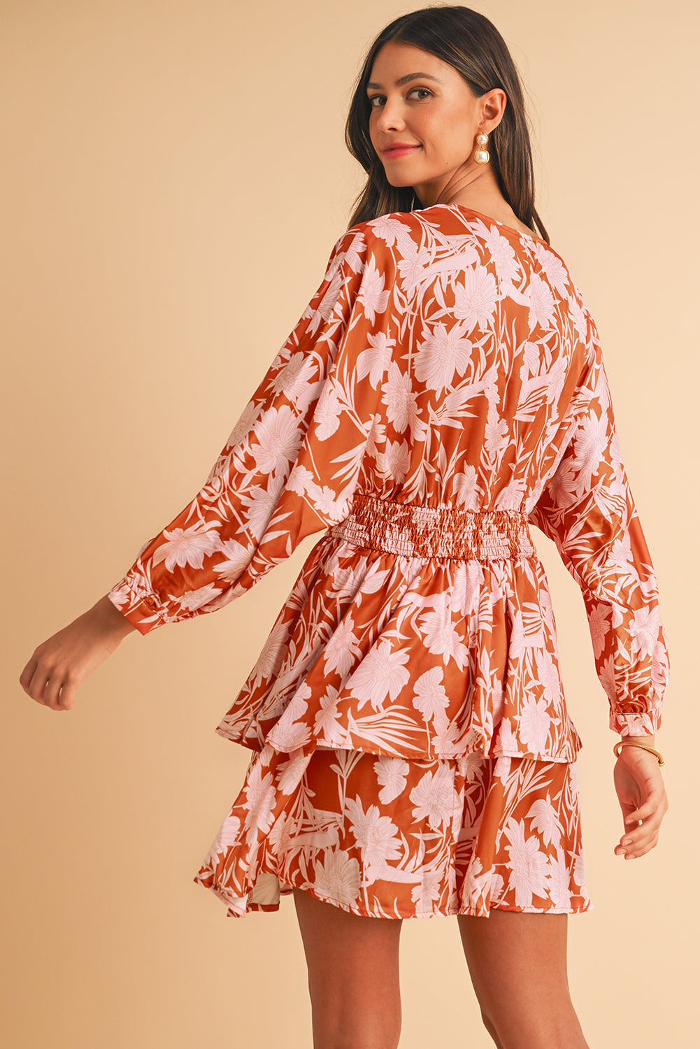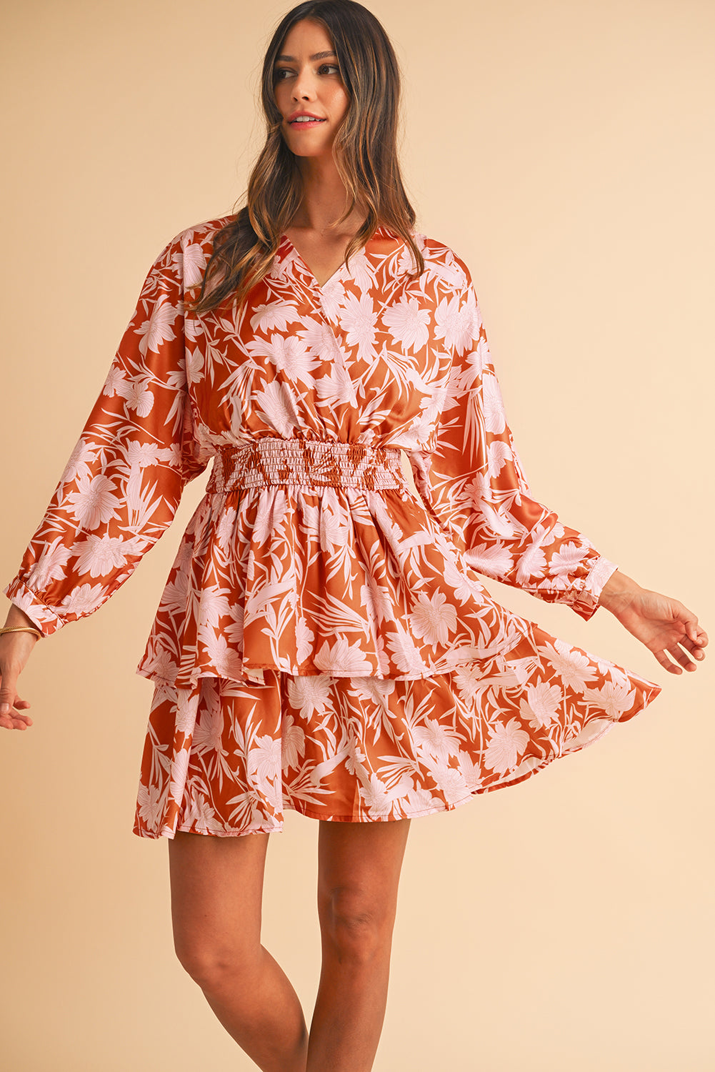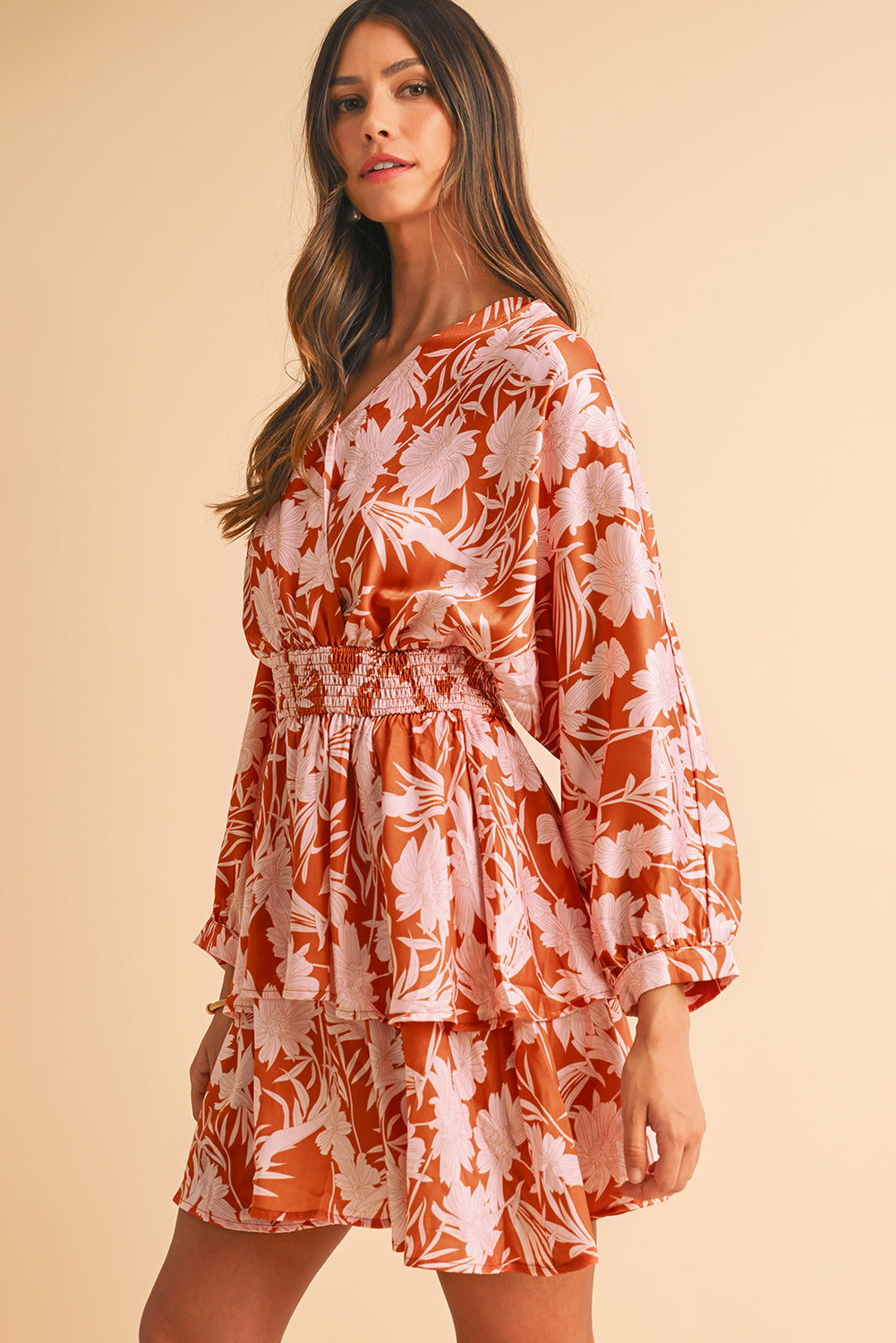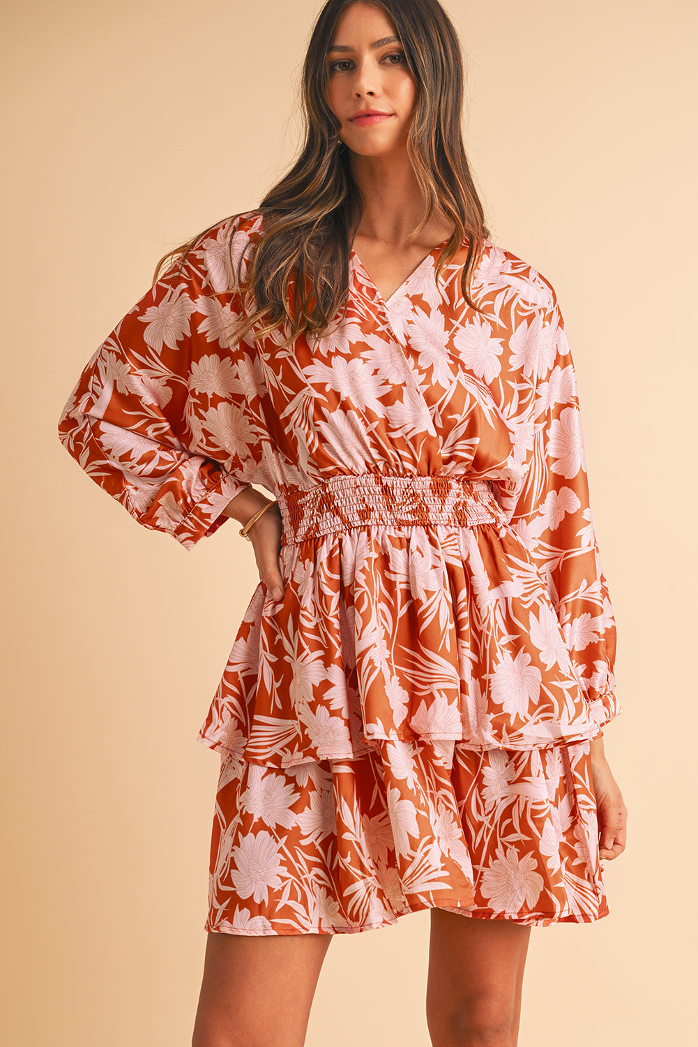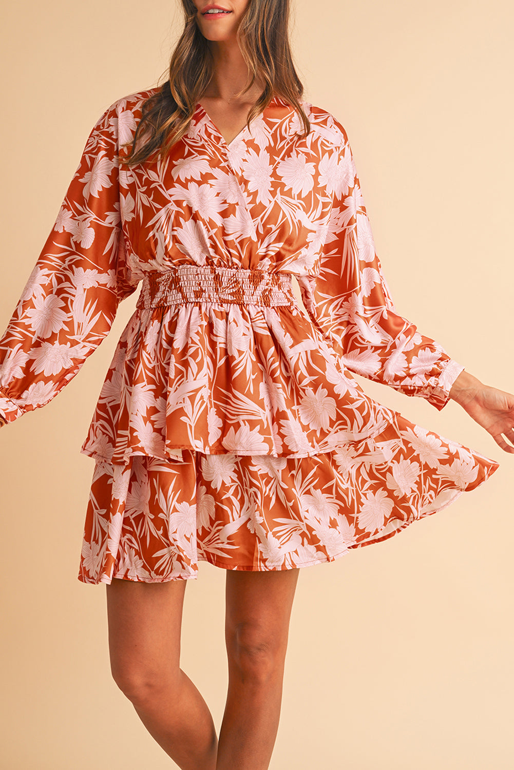 Brown Floral Puff Sleeve Shirred Waist Layered Dress