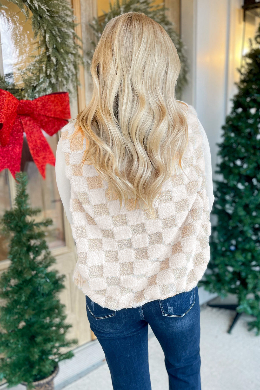 Khaki Sherpa Checkerboard Snap Button Vest Jacket
