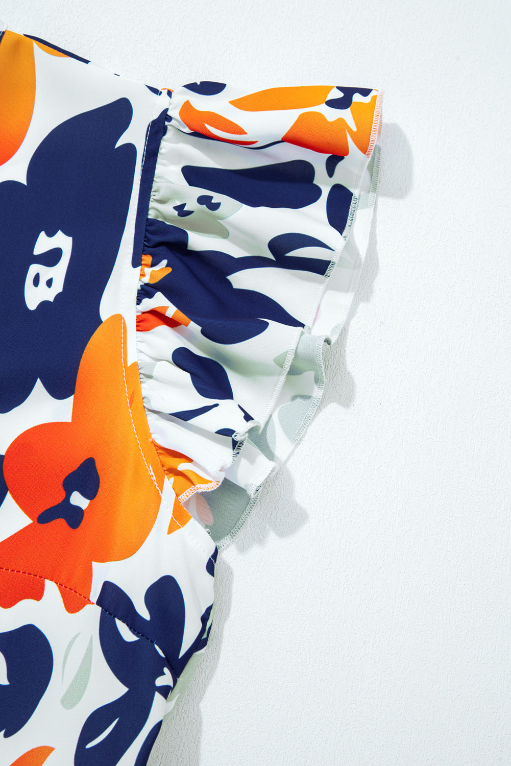 Orange Floral Print Notched Neck Flutter Sleeve Mini Dress