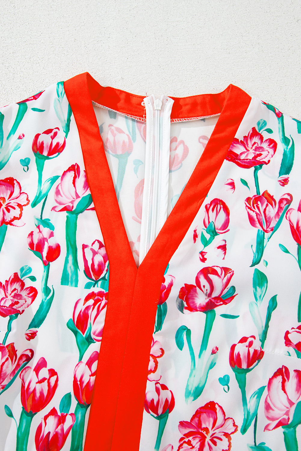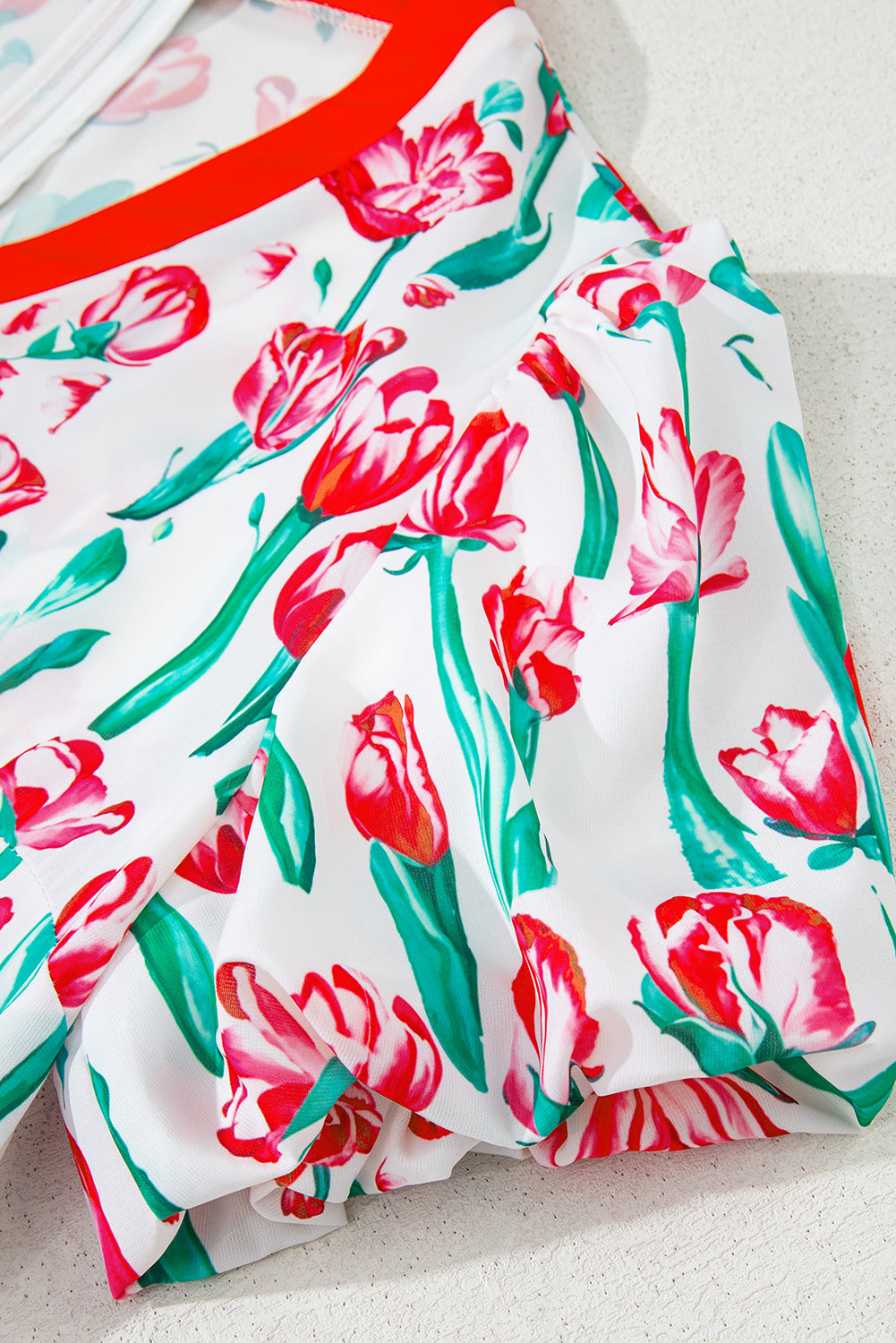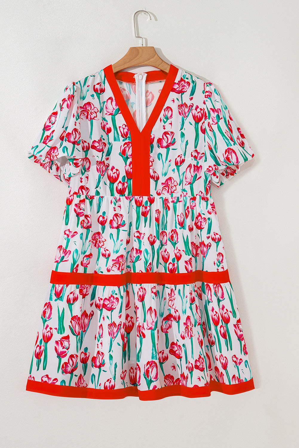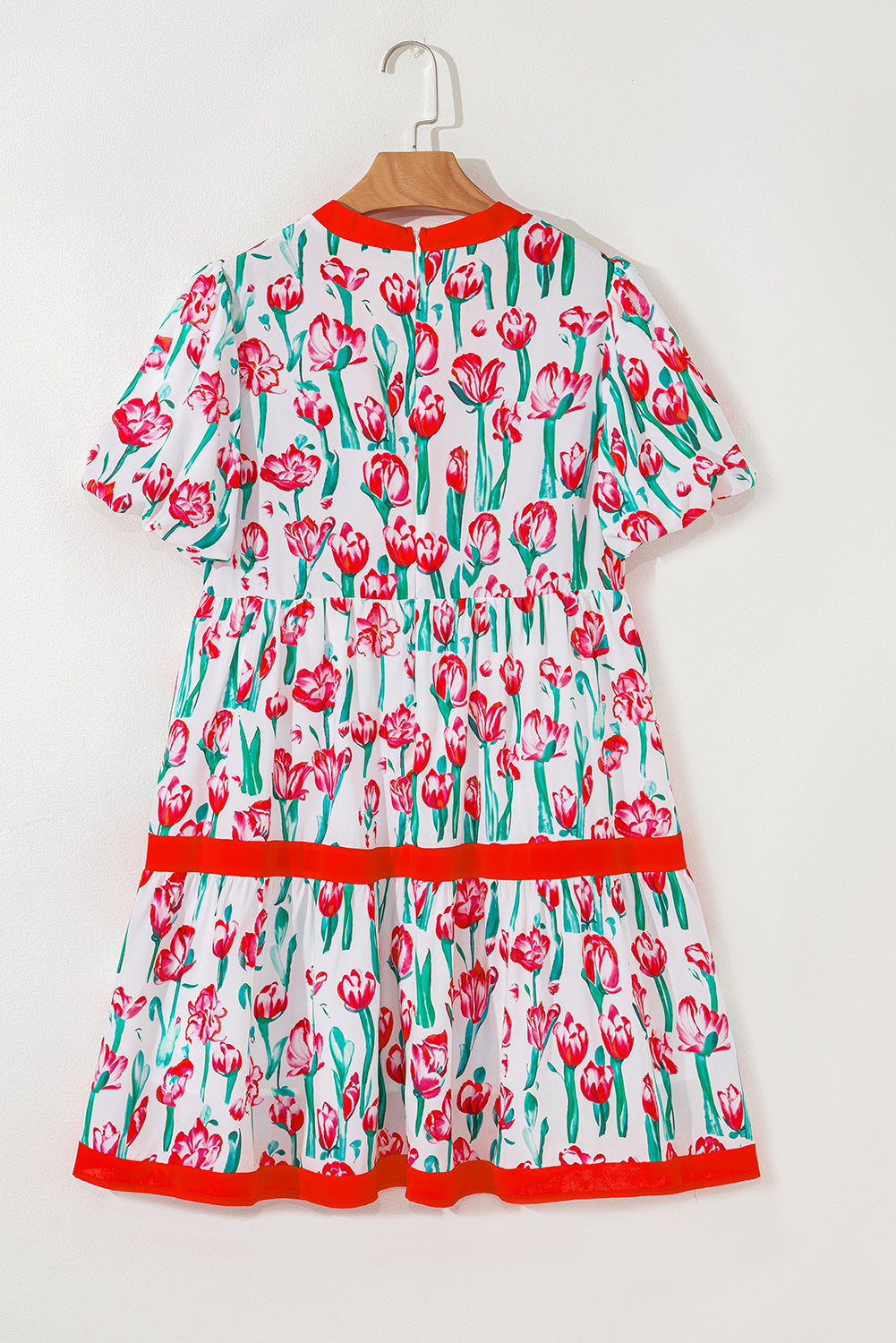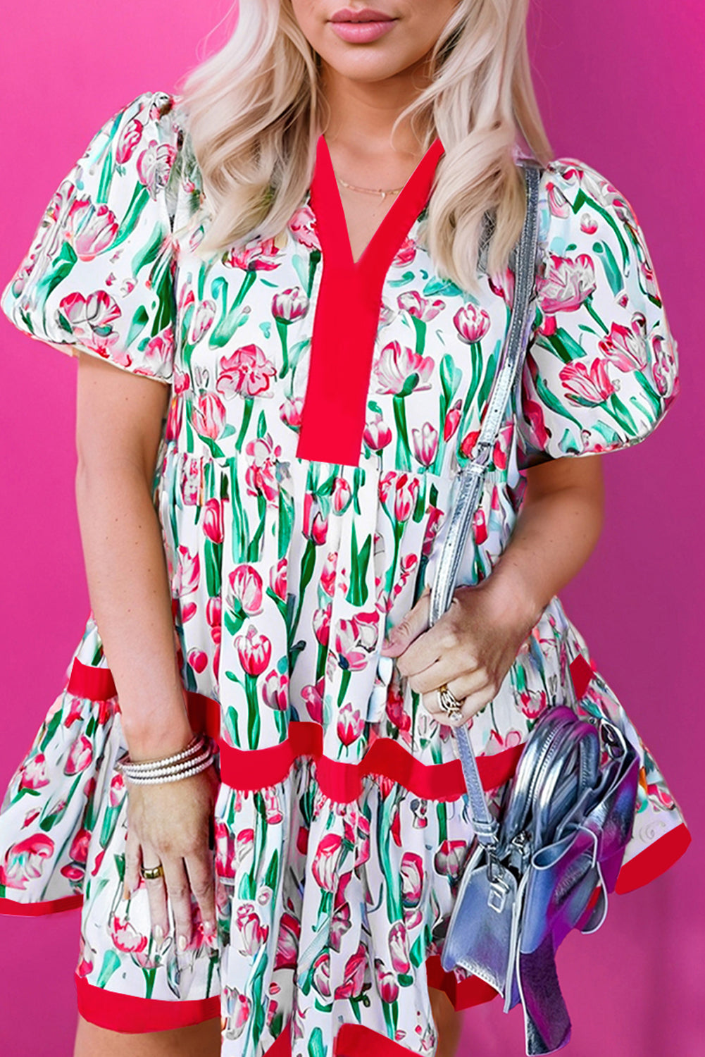 Pink Floral Print Bubble Sleeve Babydoll Pop of Color Neckline Dress