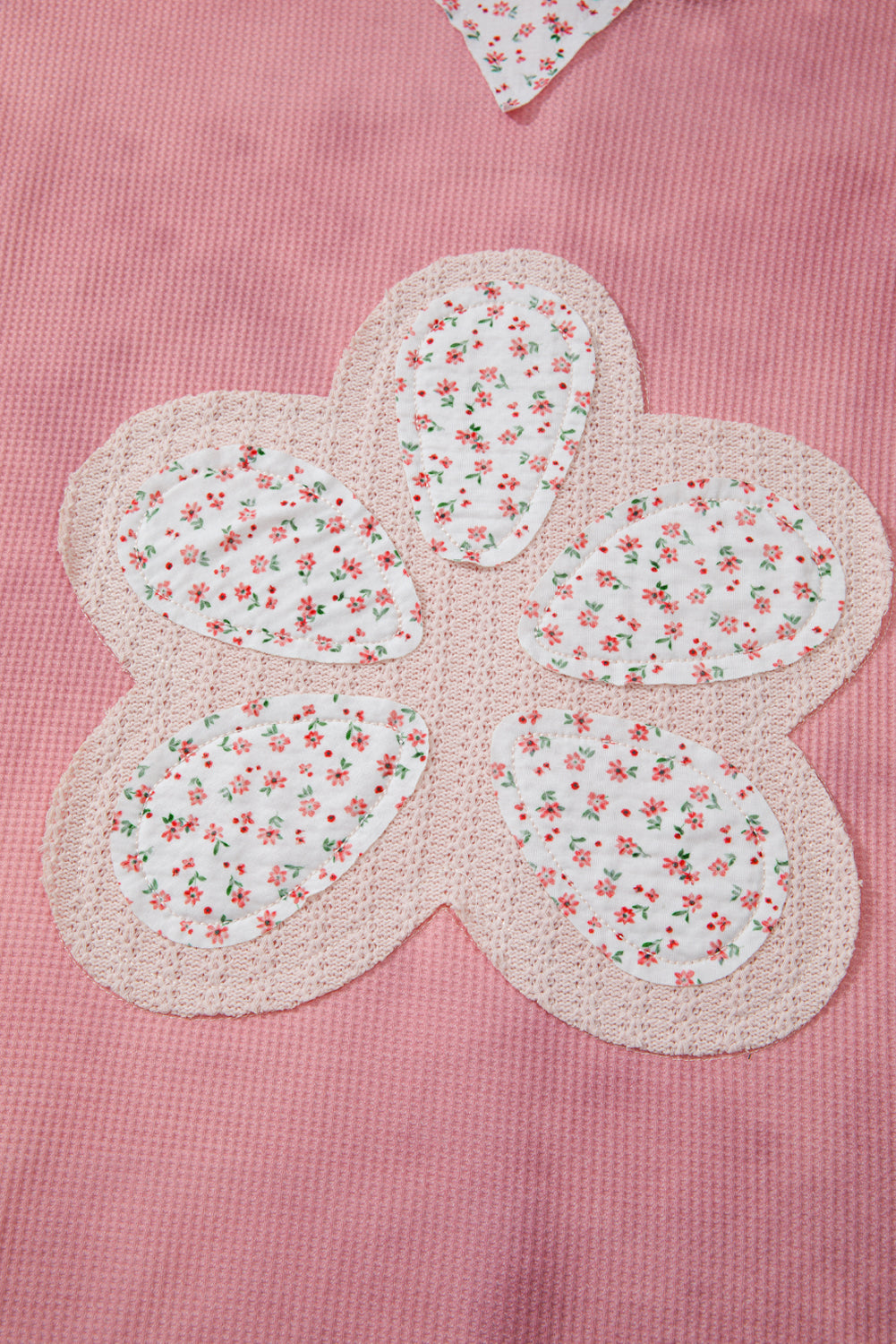 Pink Tie-dye Floral Textured Colorblock Patchwork Lantern Sleeve Hooded Top
