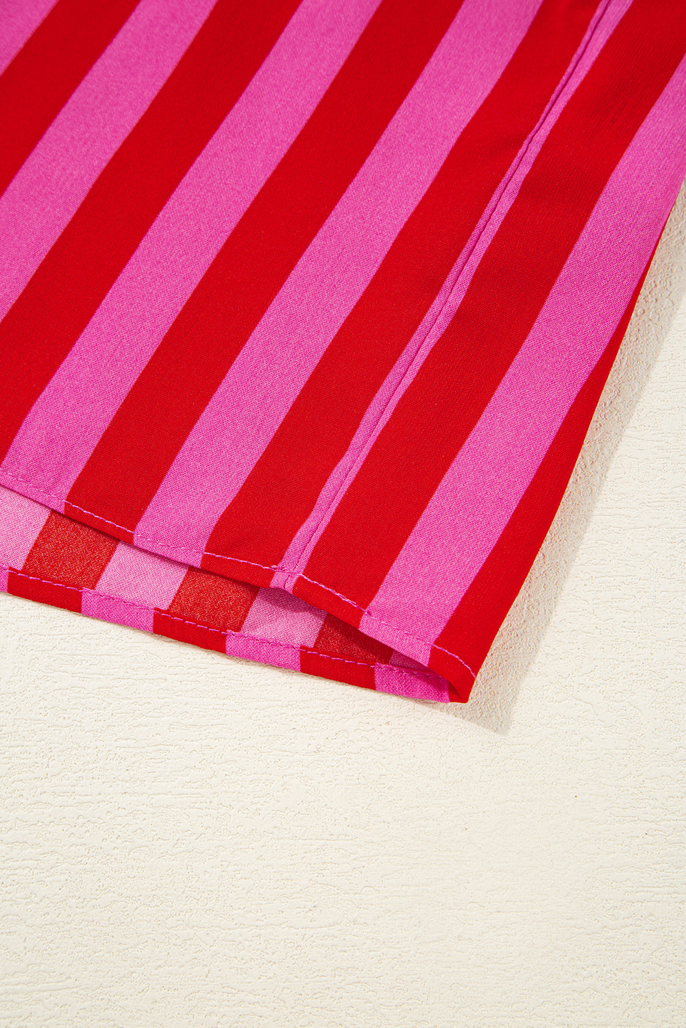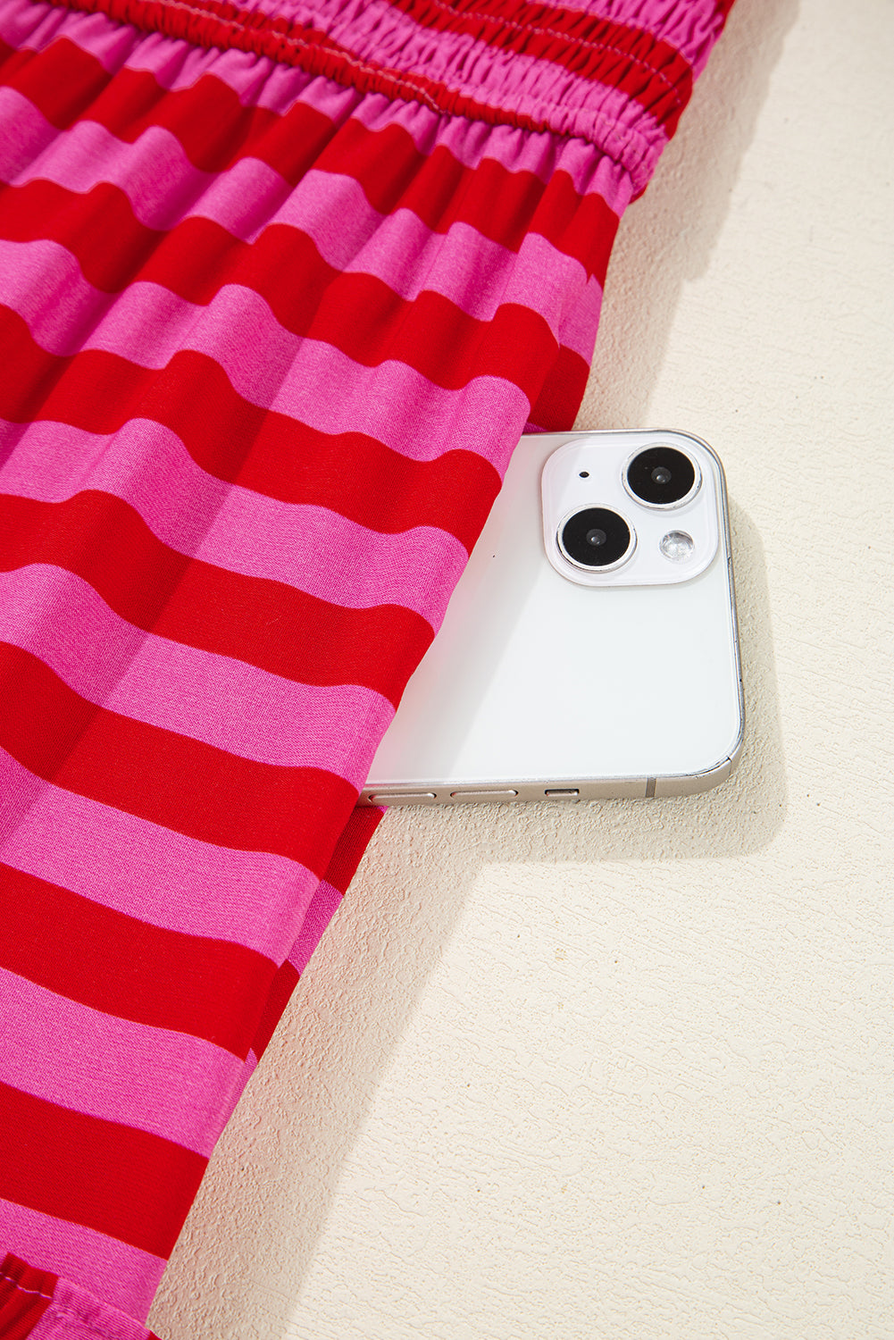 This Rose Stripe Ruffle Strap Shirred Bodice Tiered Maxi Dress combines effortless elegance with practical design. Made from lightweight 100% polyester, it features a smocked bodice and playful ruffle straps for a comfortable, flattering fit. The charming stripe pattern and tiered silhouette create graceful movement, while convenient pockets add functionality. Ideal for seamless day-to-night wear, this dress is a versatile addition to any wardrobe.
