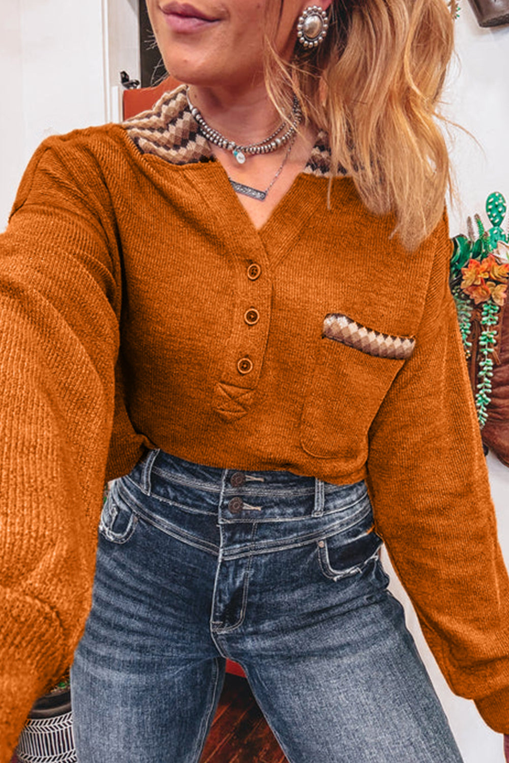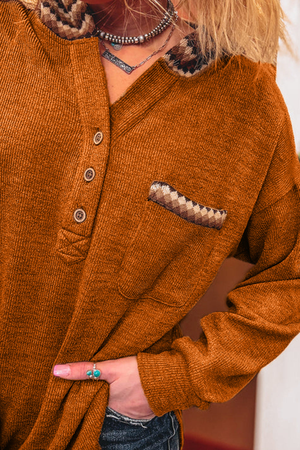 Straw Yellow Contrast Plaid Hooded Patchwork Pocket Henley Top